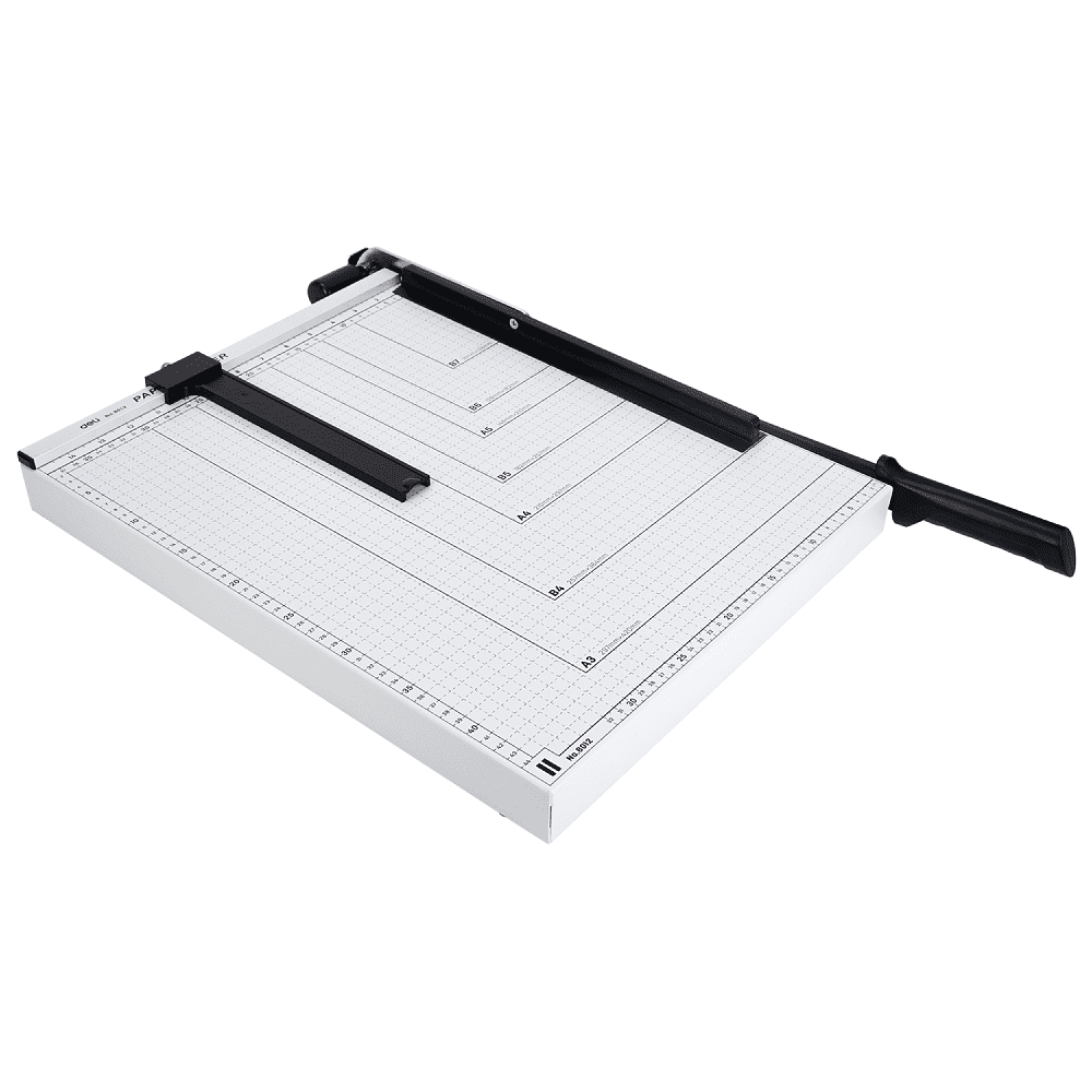 Сабельный резак Deli "E8012 A3". Стабильный металлический стол нескользящими резиновыми ножками для устойчивого положения. Практичные выемки-захваты, удобная разметка форматов на столе с делениями в миллиметрах вдоль режущей кромки облегчает выравнивание разрезаемого материала. Две угловых приставки с мм-шкалой для точной резки под 90°.