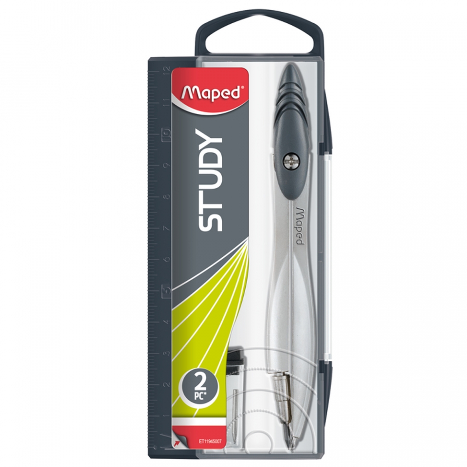 Циркуль Study 110 выполнен из цинкового сплава с эргономичной головкой, с грифелем. В пластиковом футляре. В комплекте - пенал с дополнительным грифелем. Металлические штанги.